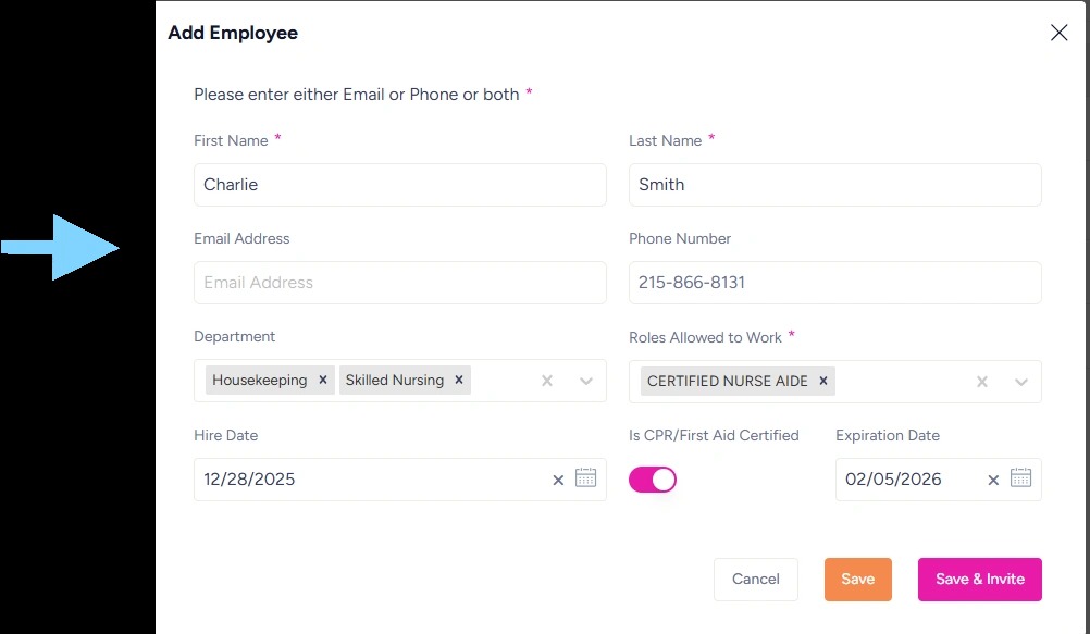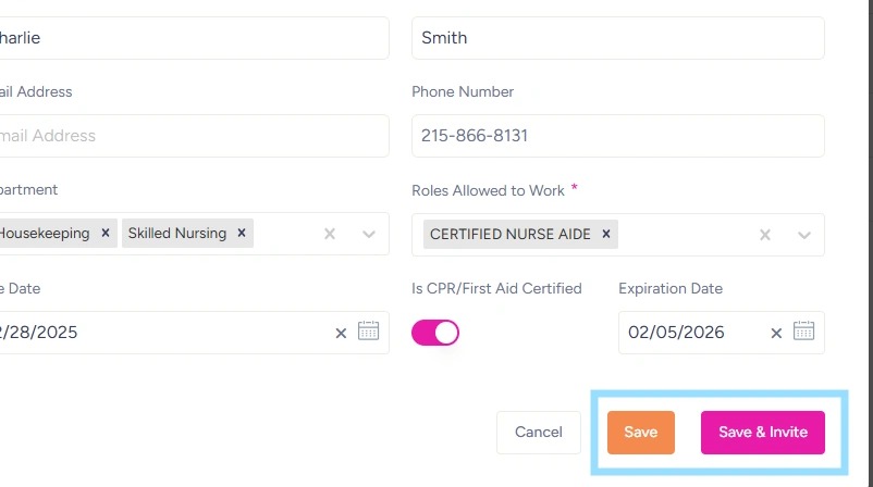 Save & Invite will result in an invite sent to employee’s phone number or email address immediately.