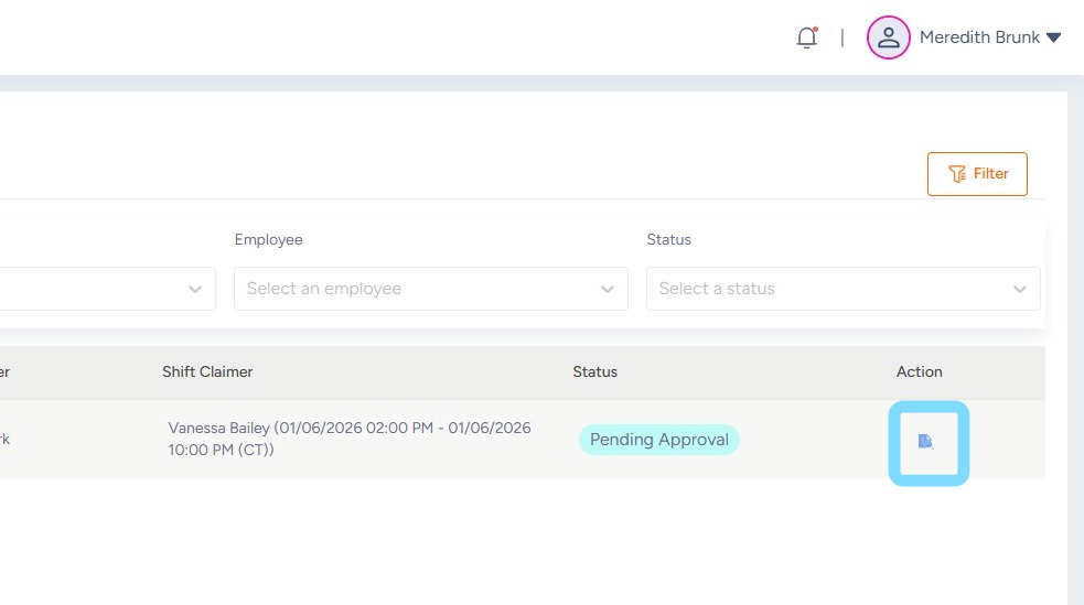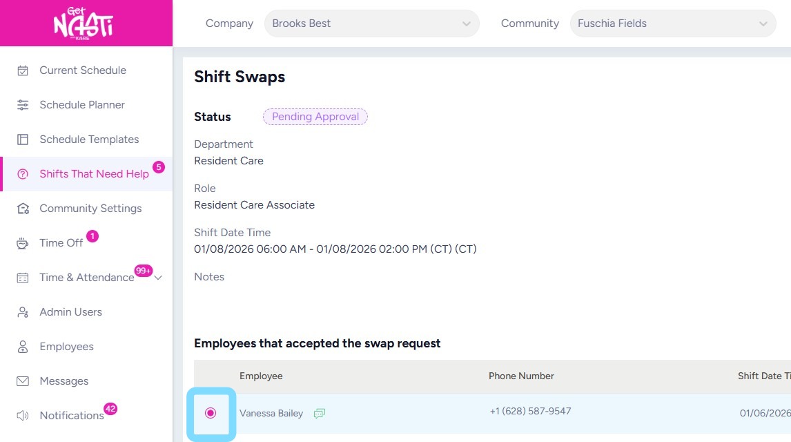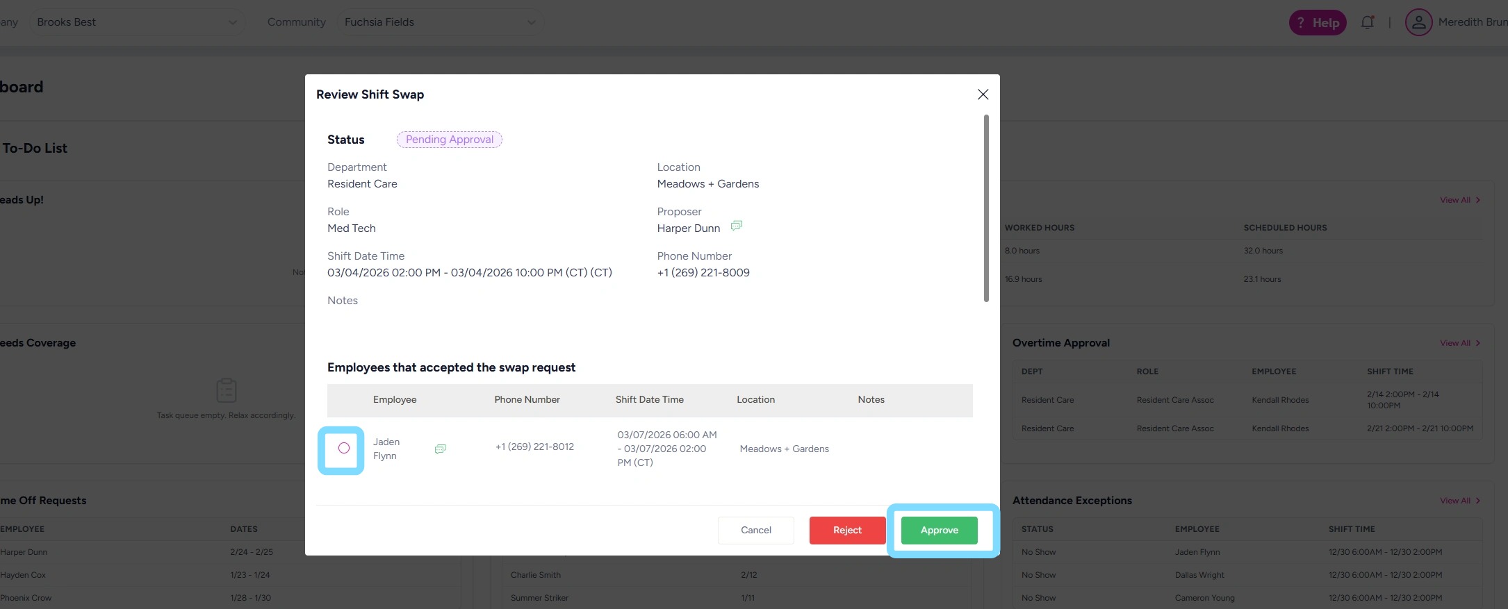 From the Needs Approval box, select the Shift Swap Claim to review and take action.