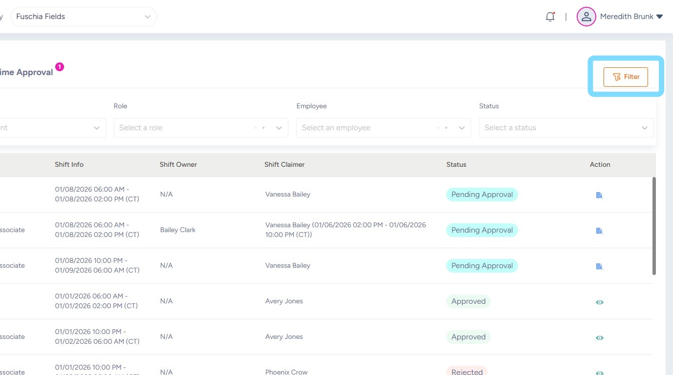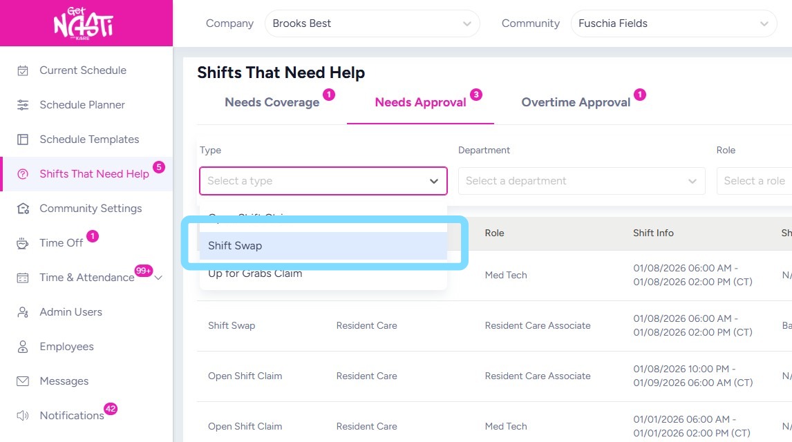 4. The user may review and take action on Shift Swaps from this full list or specifically filter for Shift Swaps by type.