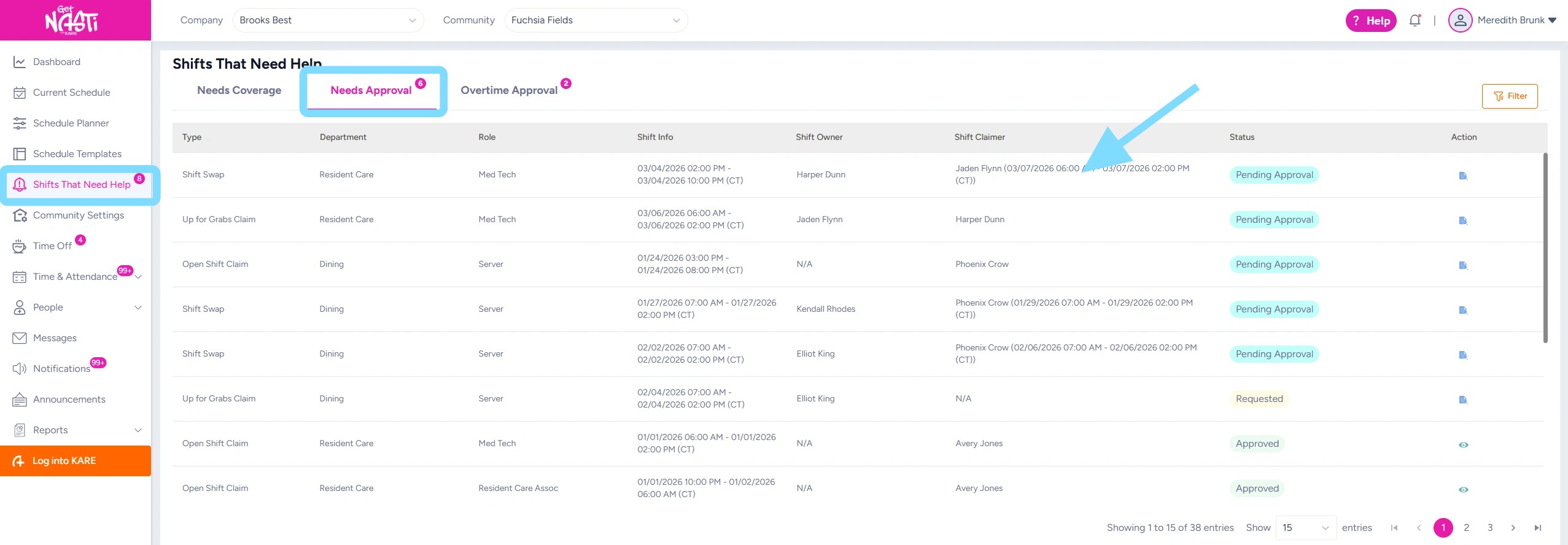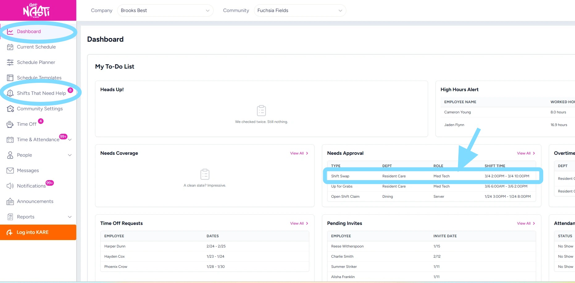 This guide shows how to review and approve Shift Swaps so coverage stays tight, chaos stays out, and employees get the flexibility they crave. Note: Shift Swaps only require approval if your community’s Schedule Rules are set to require it. Otherwise, swaps made by eligible employees who meet overtime and rule requirements are automatically approved by the system. These swaps will still be visible in Shift History, but no manager action is required.