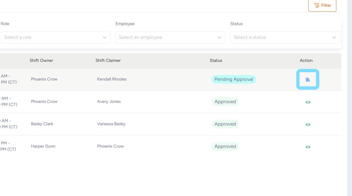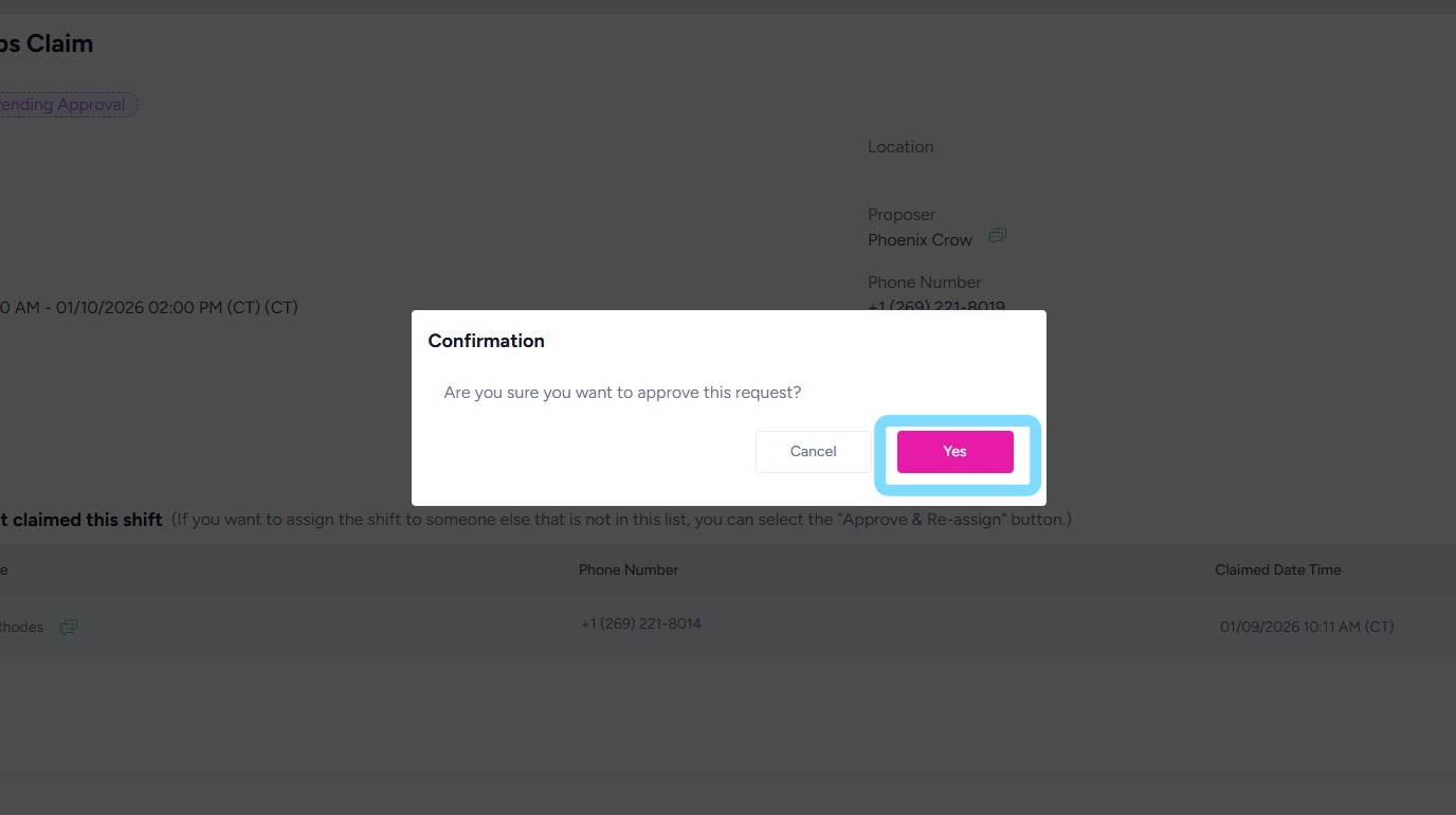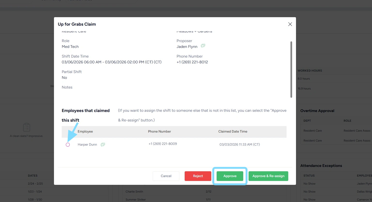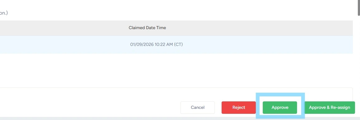 If the shift should be assigned to a different employee, select Approve and Re-assign to assign the shift to an employee who did not submit the claim.