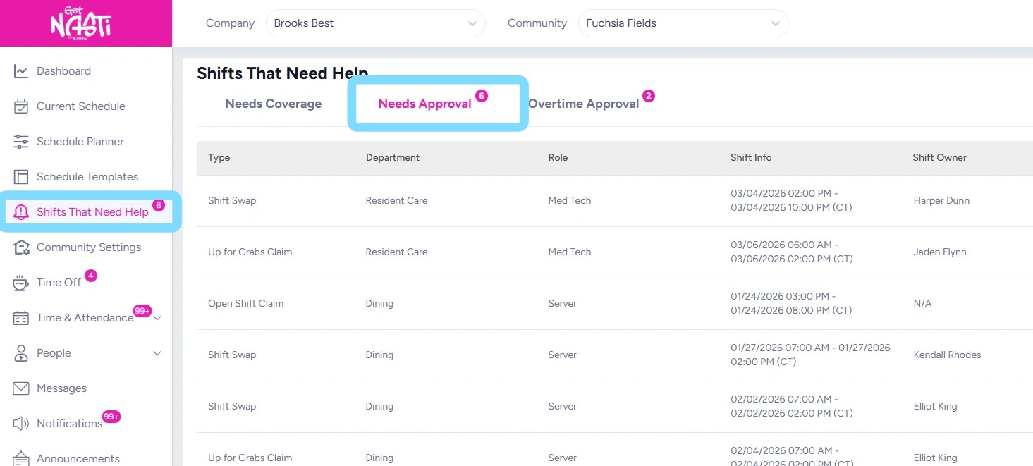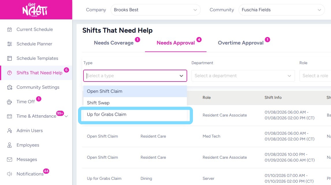 This guide shows how to review and approve Up for Grabs Claims so that coverage stays tight and employees are given the flexibility they crave! Note: Up for Grabs Claims only require approval if your community’s Schedule Rules are set to require it. Otherwise, claims made by eligible employees who meet overtime and rule requirements are automatically approved by the system. These claims will still be visible in Shift History, but no manager action is required.