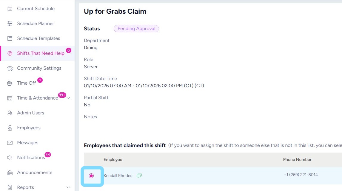 7. Select the circle next to the employee whose Up for Grabs Claim will be approved.