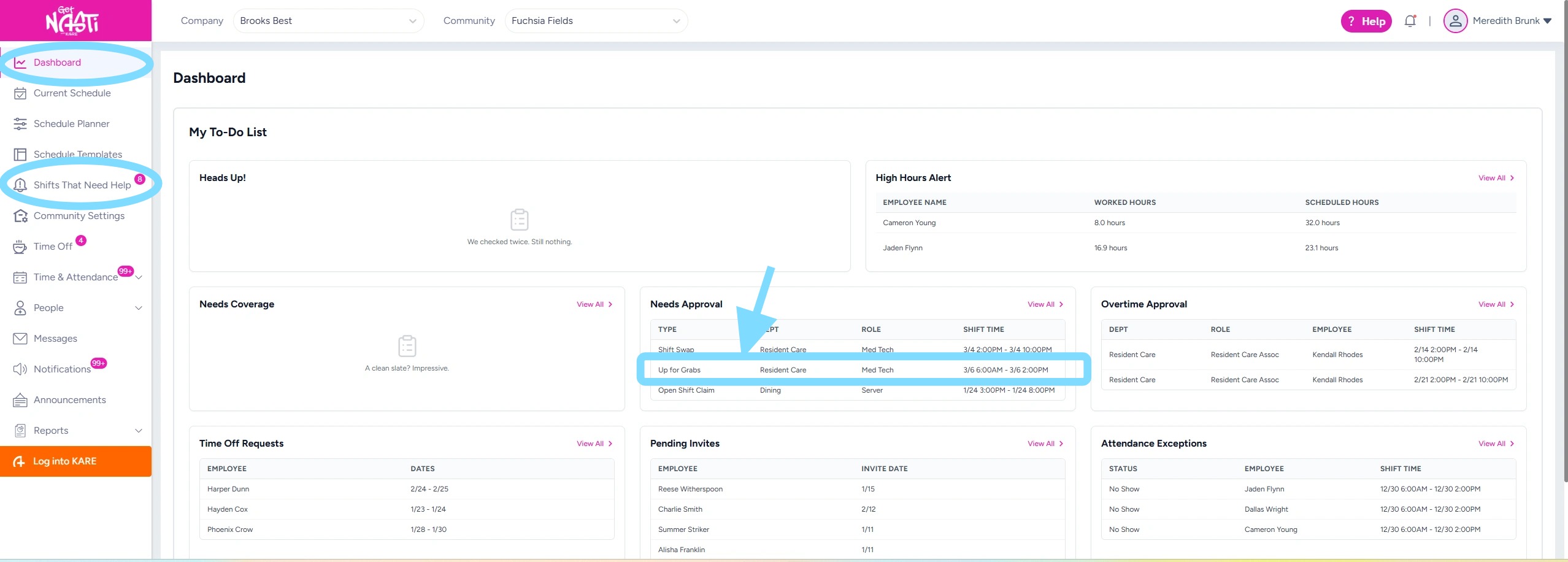 1. Up for Grabs Shift Claims can be managed and approved from two locations: