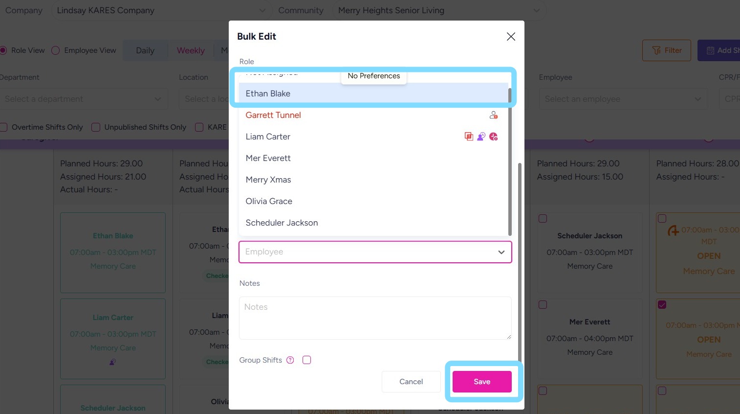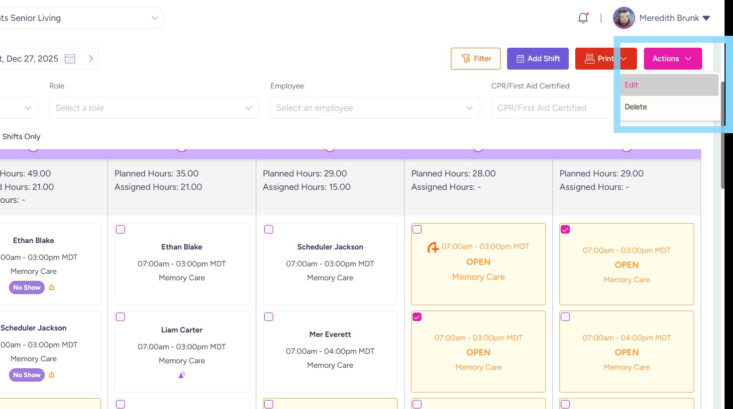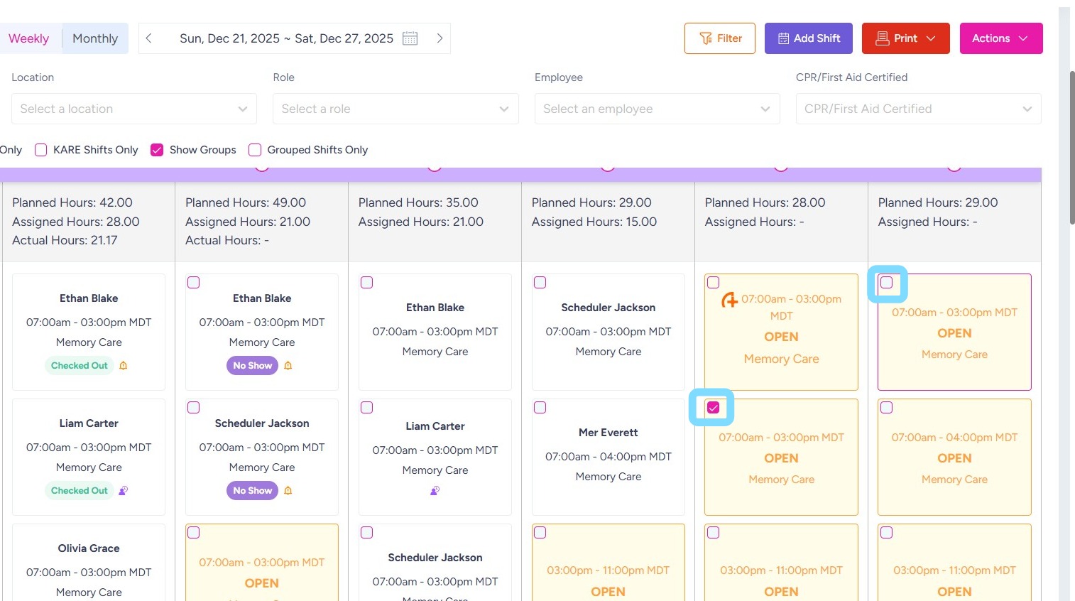 1. Select the open shifts you want to assign by checking the box within one or more shifts.