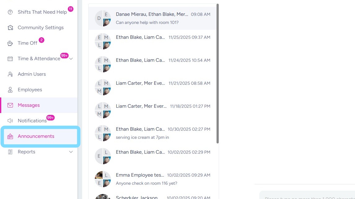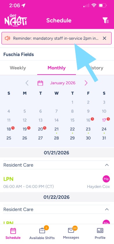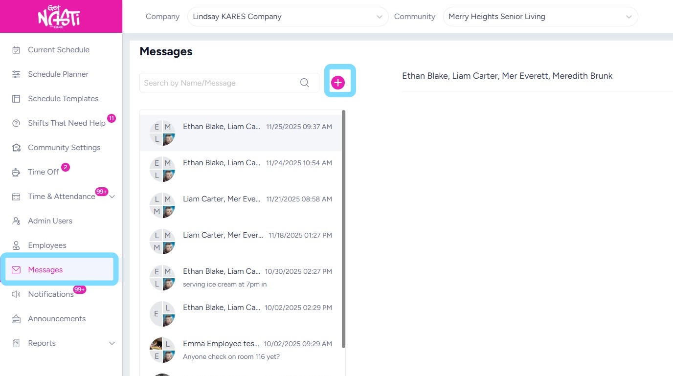 NASTi allows easy, in-app communication to ensure all staff and admins stay in sync. Messaging offers two-way communication between two or more people within the community – employees and admins. Announcements offer one-way communication from admins. Announcements can be sent to full community, or by department, role, or admin permission set. Disclaimer: Refrain from entering resident specific information in communications due to NASTi not being HIPAA protected at this time.