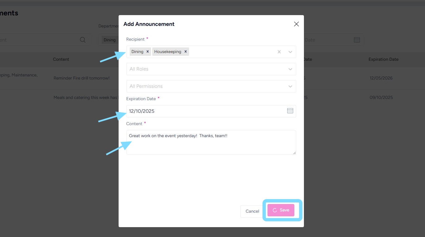 6. Choose Recipients to receive the announcement. Note: recipients can be everyone assigned to a Department, everyone assigned to a Role, or everyone with specific admin permissions.