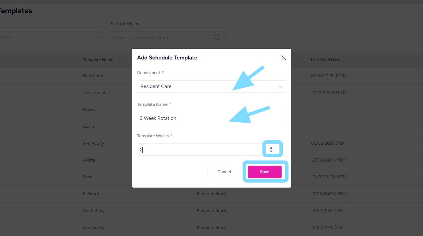 Schedule Templates take the grind out of scheduling by providing reusable, department-specific blueprints with roles, locations, days, and times already built in. Templates lock in your staffing structure while keeping the flexibility to assign or reassign employees later. Once created, templates allow you to apply and publish schedules weeks in advance—turning hours of work into minutes – freeing you up to focus on leading your team and supporting residents.
