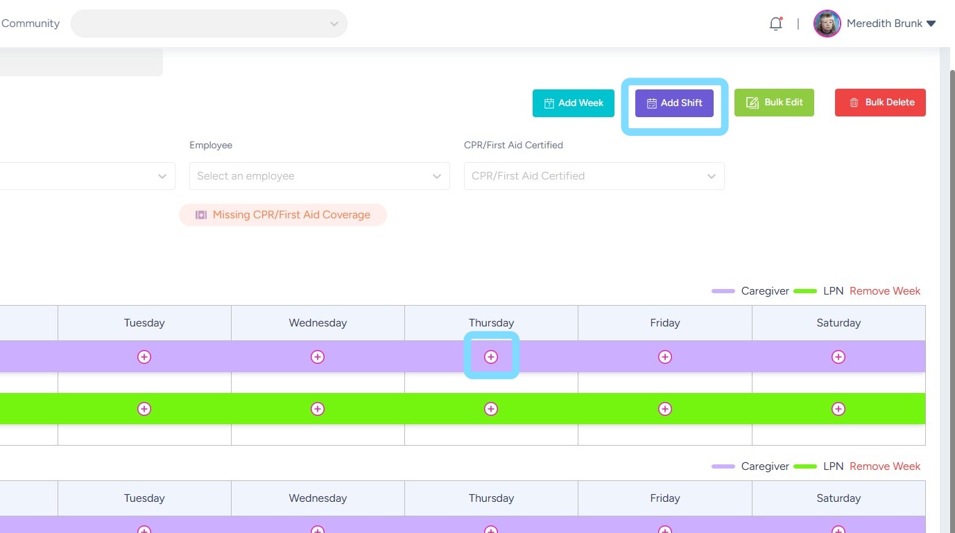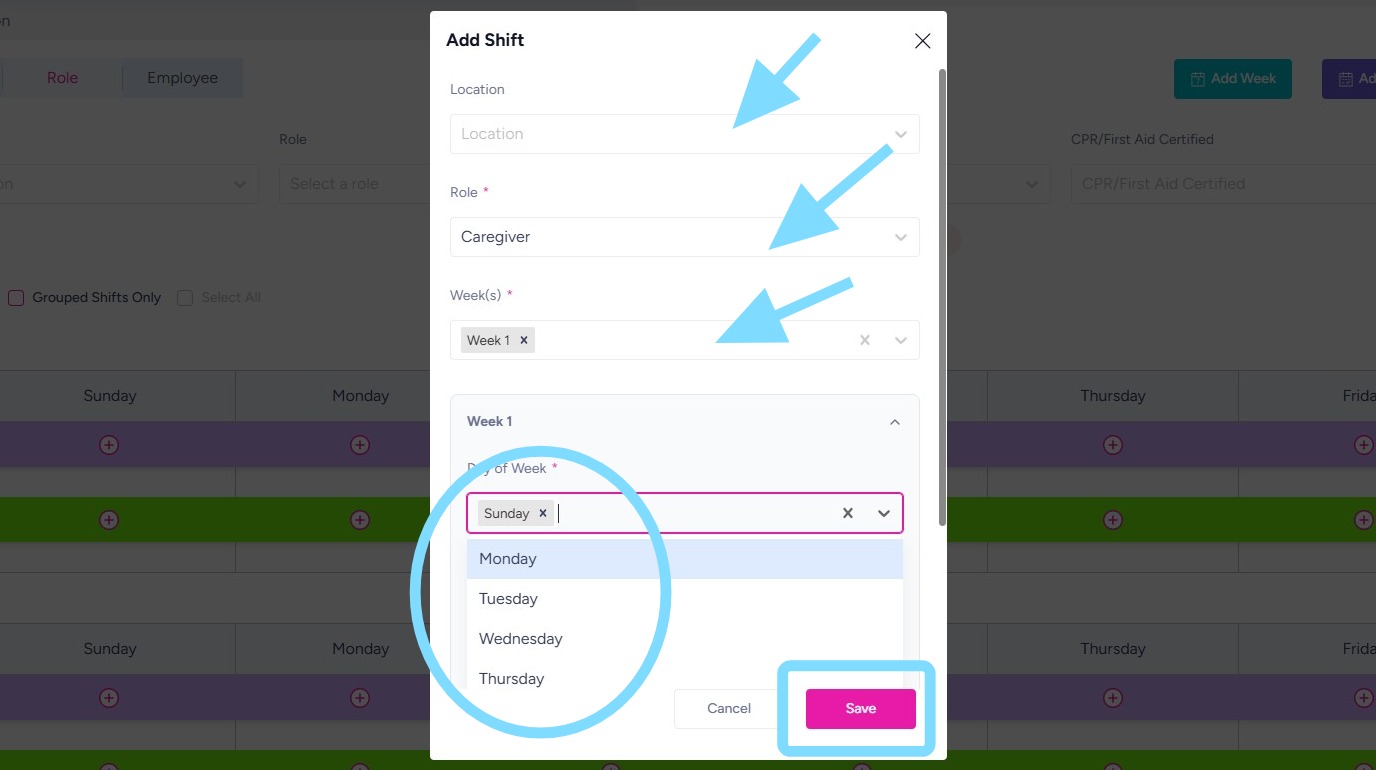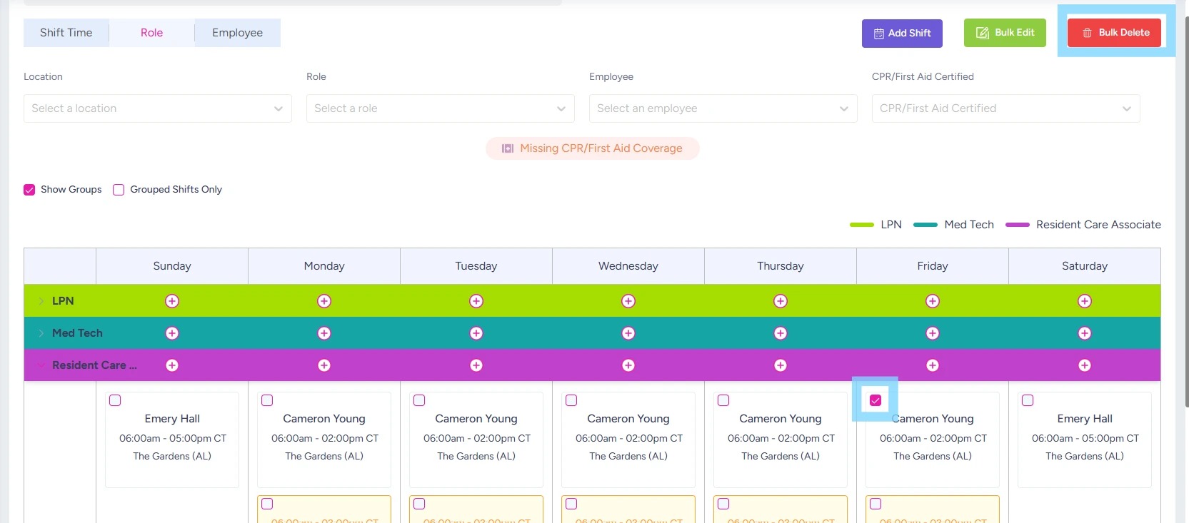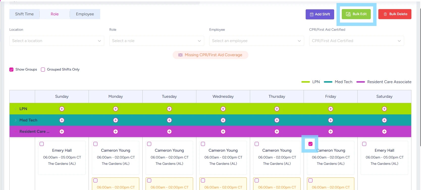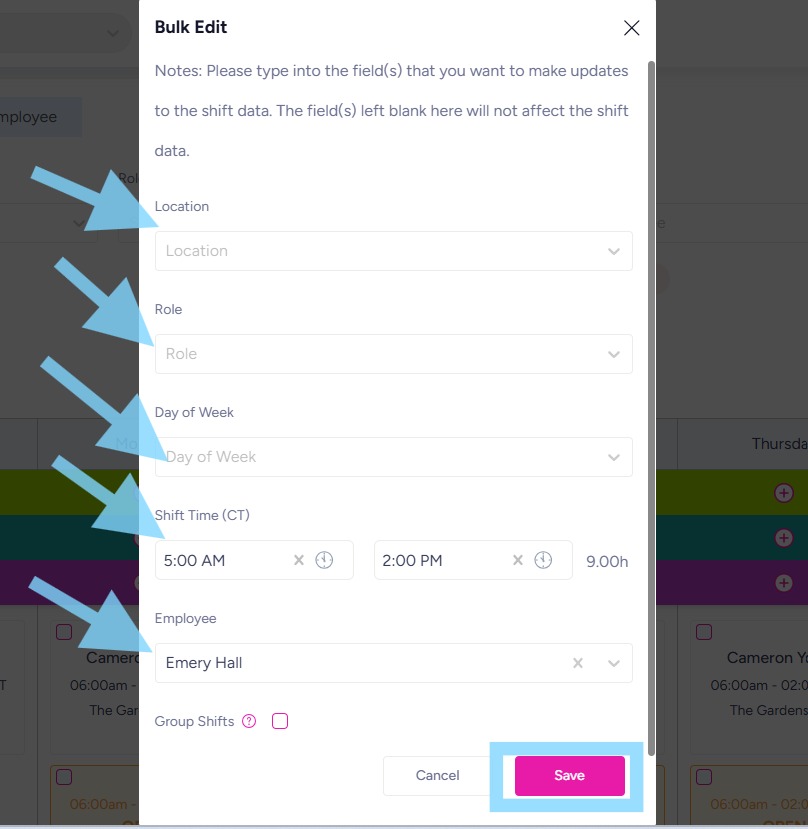 11. Edit any component of the shift, including Location, Role, Day of Week, Shift Times and Employee. In this example, the Shift Times and Employee assignment are modified.