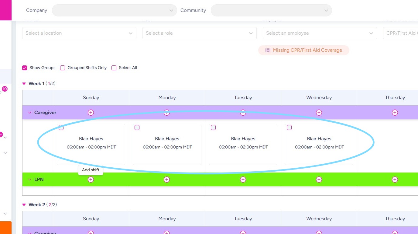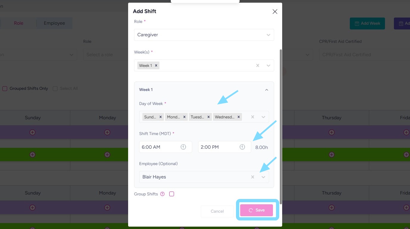 6. In this example, for Week 1, we’re adding shifts on Sunday, Monday, Tuesday, and Wednesday from 6:00 AM to 2:00 PM and have assigned the shifts to employee Blair Hayes.