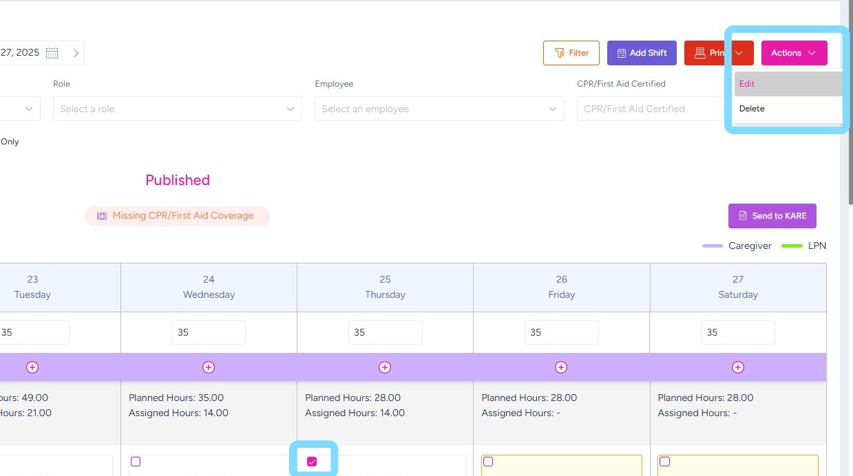 Option 1: Select the checkbox next to the shift, then choose Action → Edit. Now proceed to Step 4