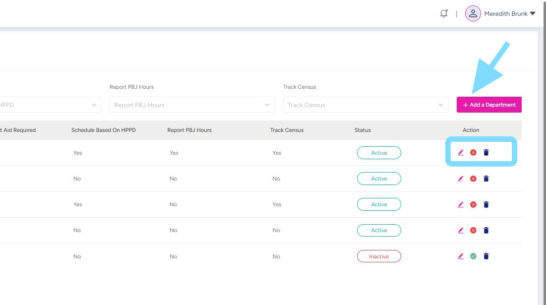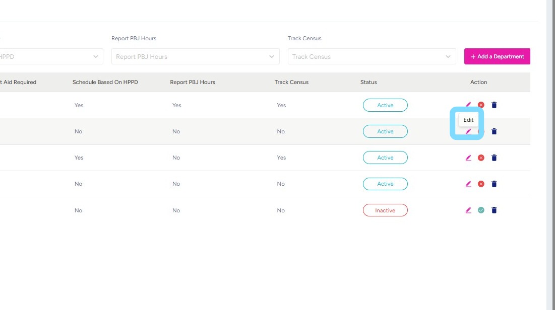 Admin User may also edit, deactivate or delete a department selecting the corresponding icon