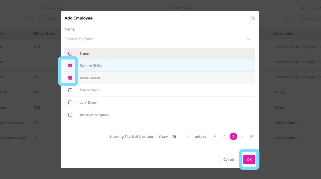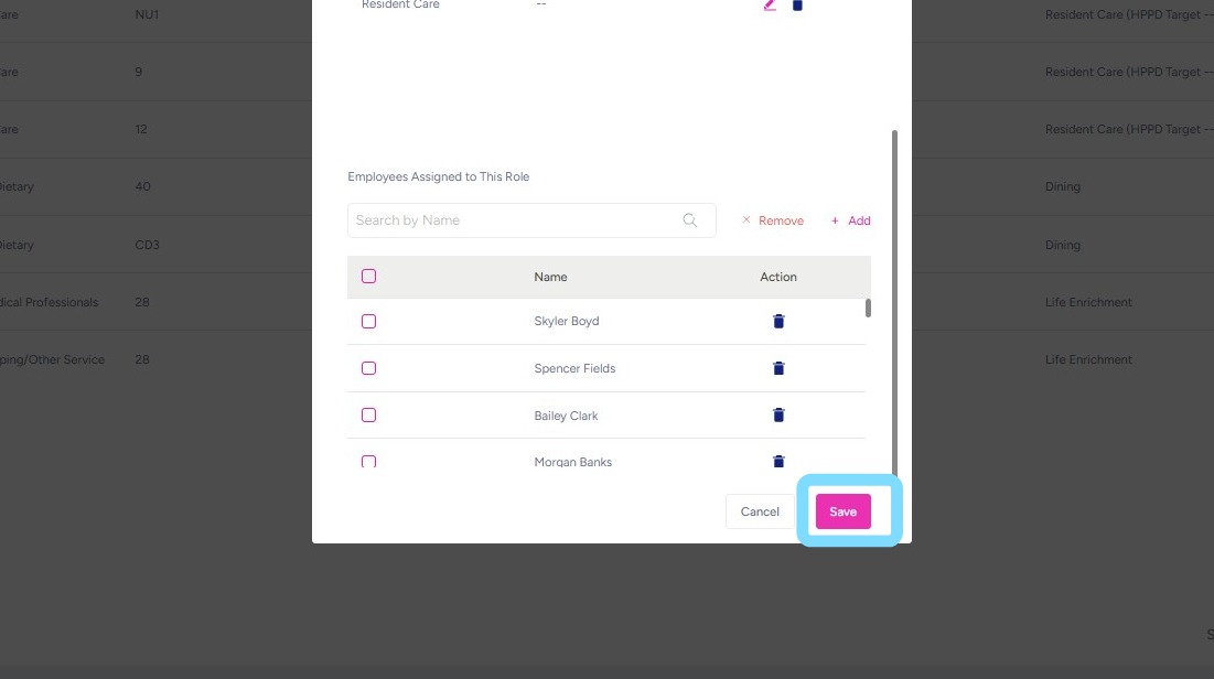 8. The user is checking the boxes next to employee names for addition of these employees to this Role.
