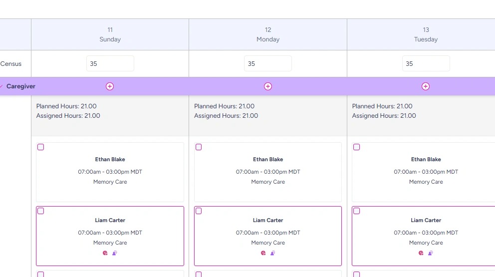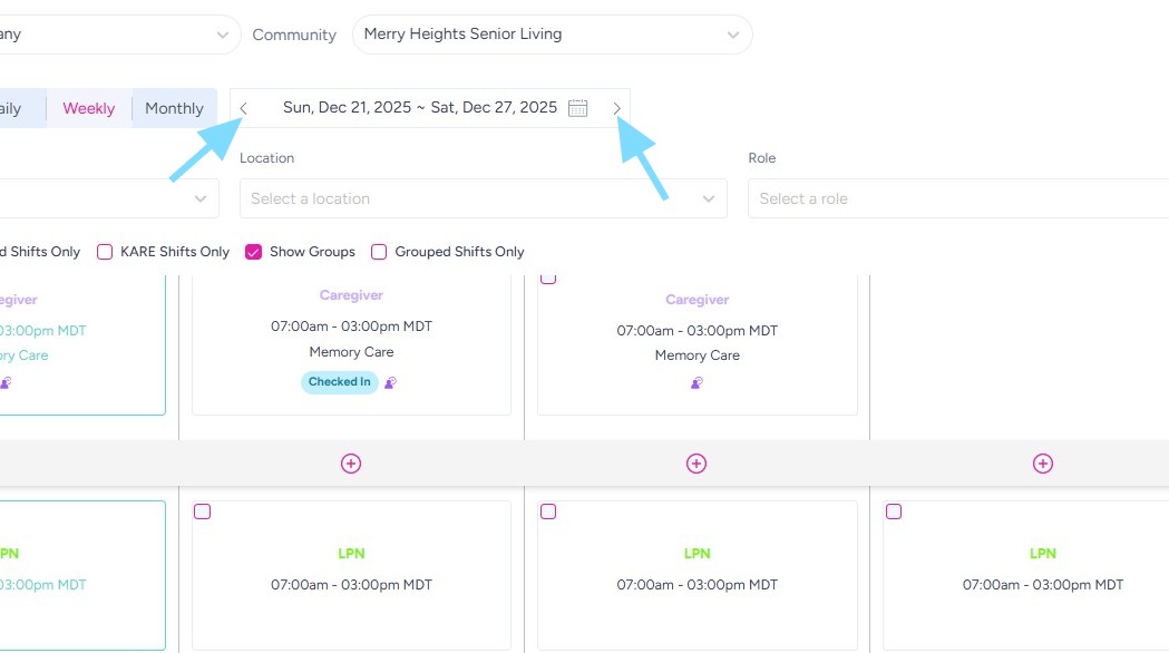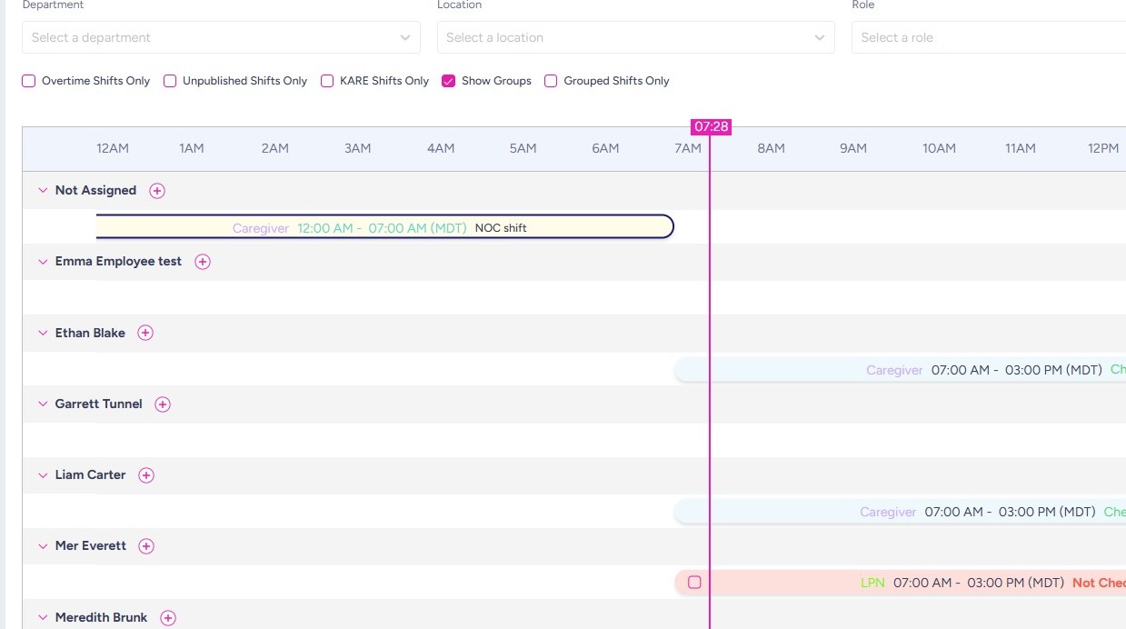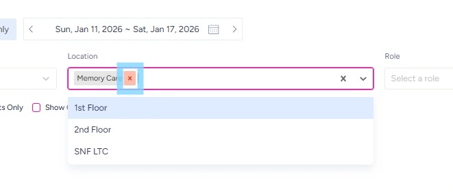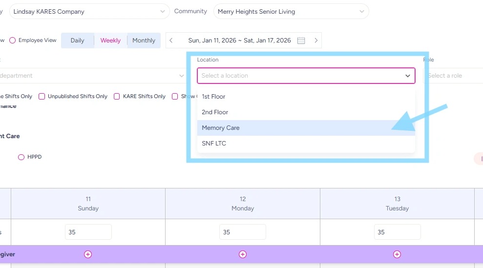 Now the user is only viewing the schedule with shifts assigned to Memory Care location.