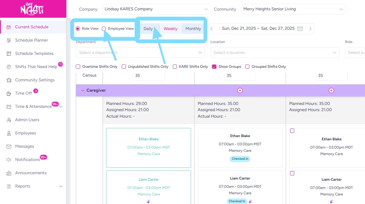 5. In addition to filters, users may also customize their view of the Current Schedule by Role View, Employee View, or Daily, Weekly, or Monthly views. The default setting is Role View and Weekly view.
