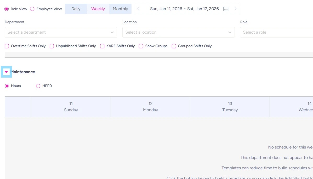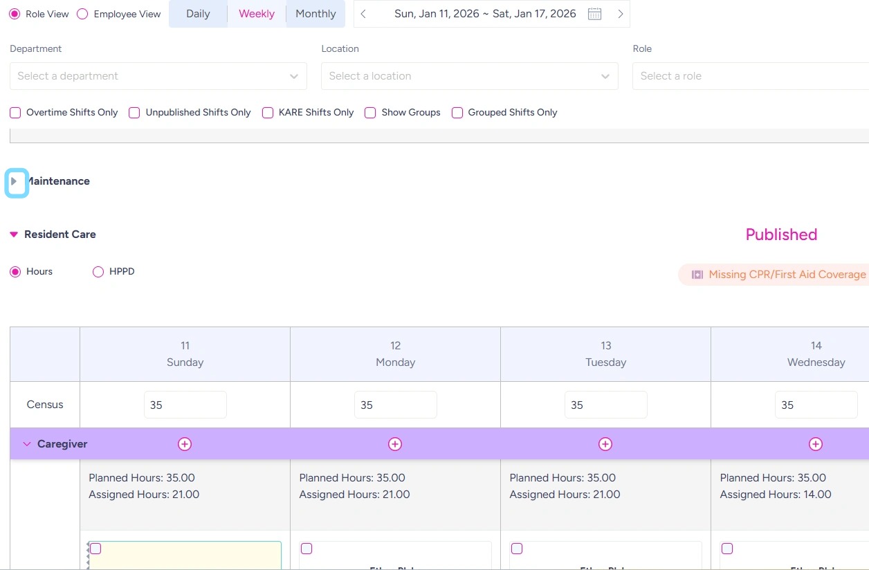 9. Example: the Maintenance department schedule is now collapsed so that the Resident Care department is viewable without as much scrolling. The user may click on the arrow next to the Maintenance department to open up the schedule again.