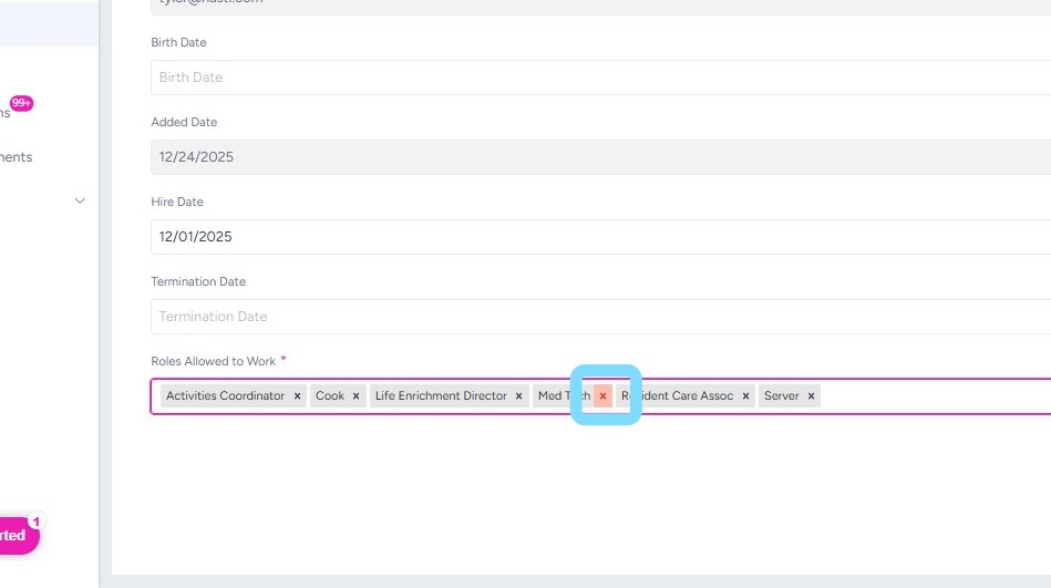 3. To remove Role from employee, select the X next to the role, within the Roles Allowed to Work field.