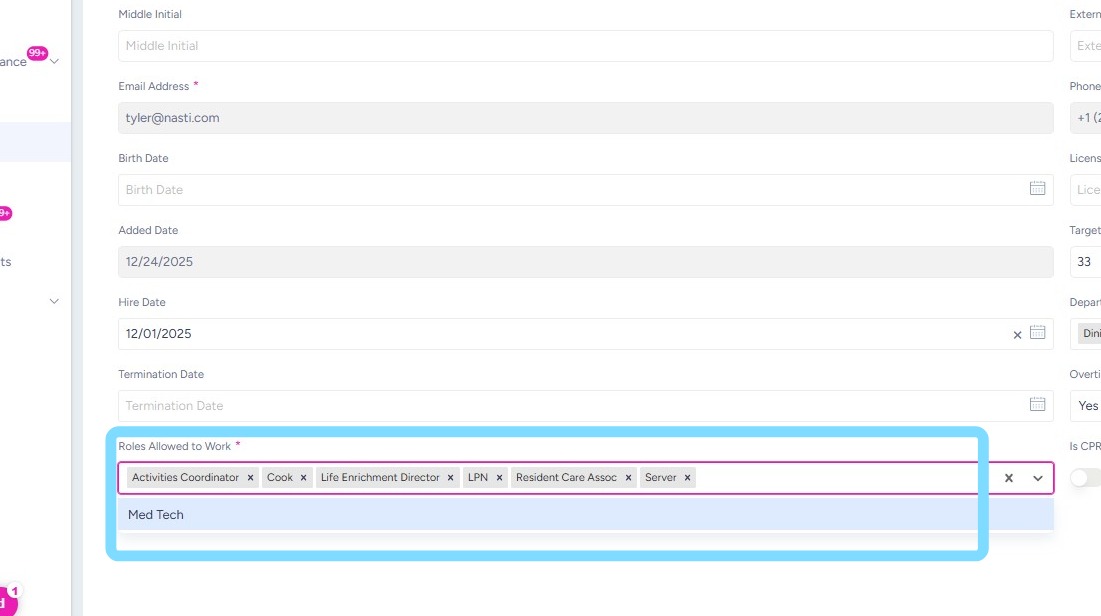 4. To add a Role, select from the Roles Allowed to Work dropdown list.
