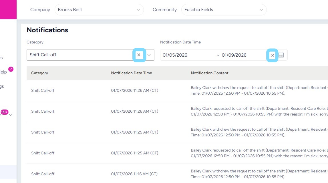 7. To clear filters and return to viewing all notifications, select the x within the drop down box.
