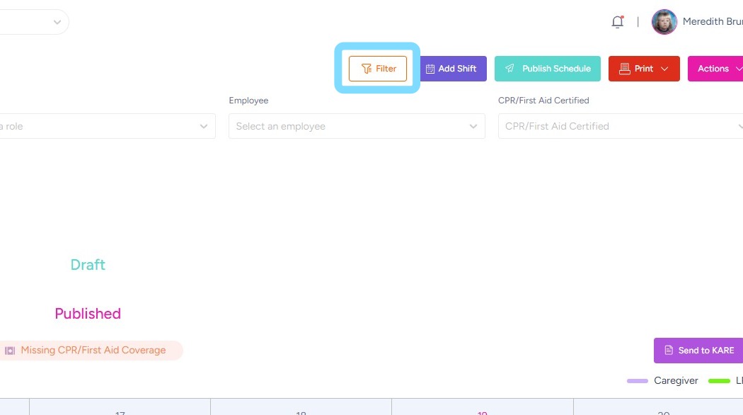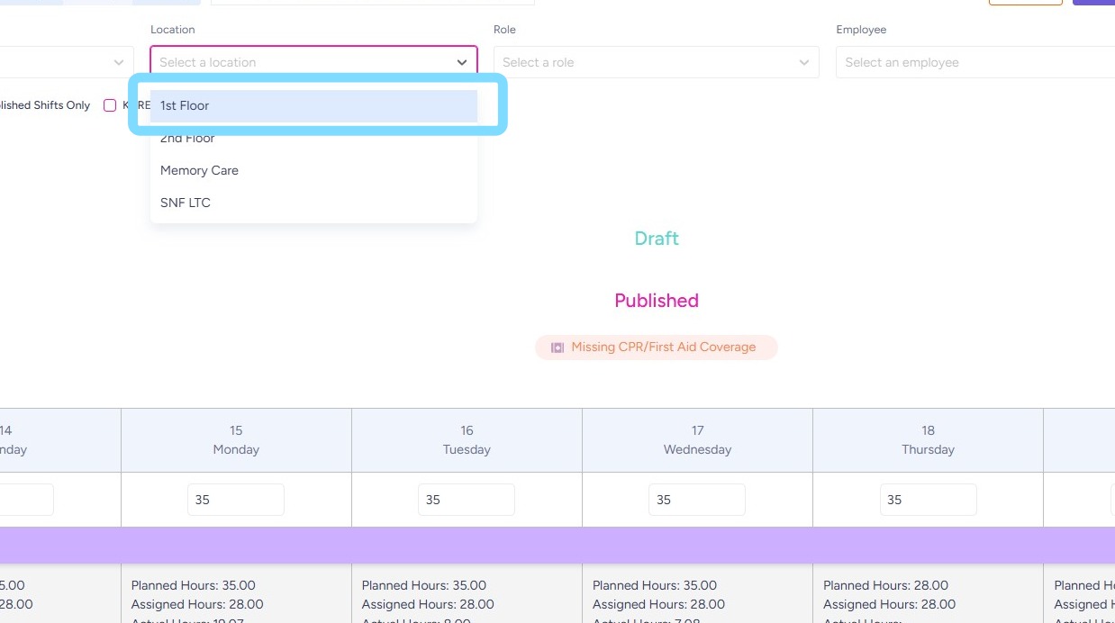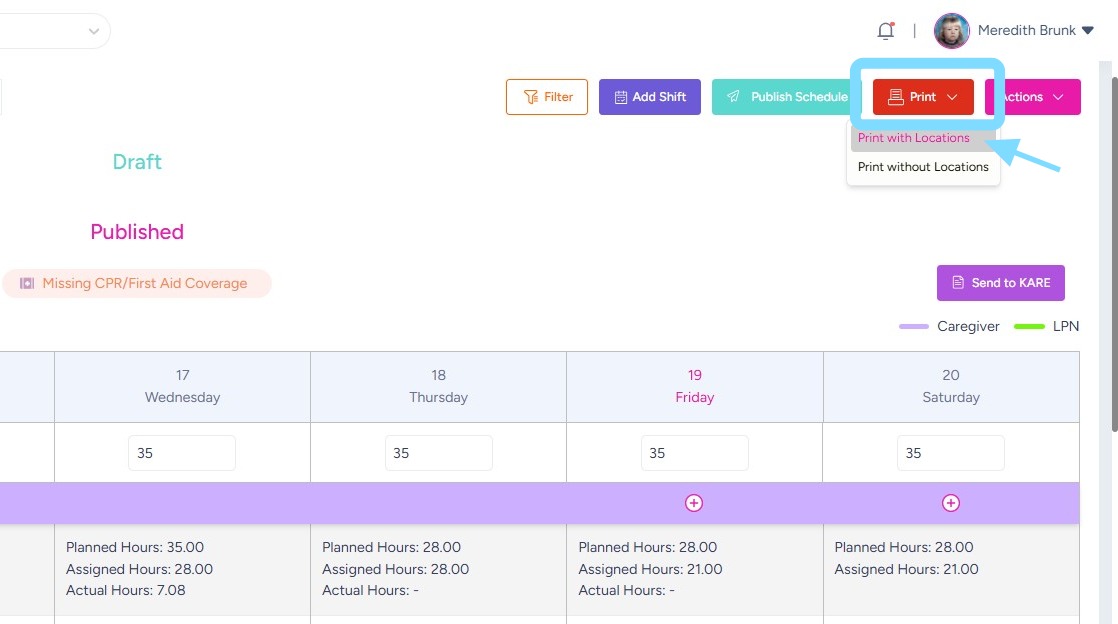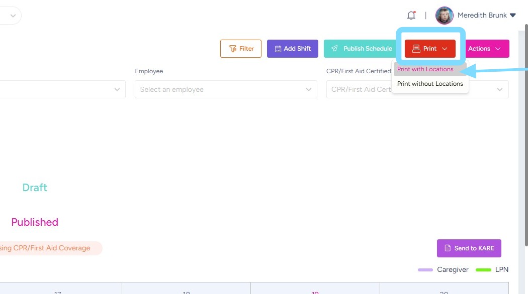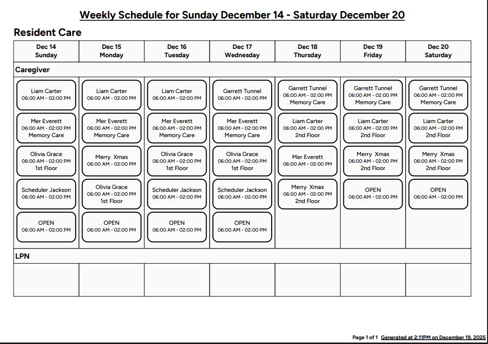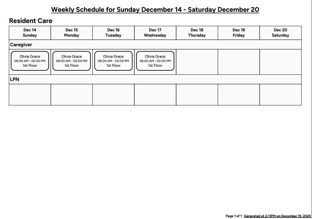 Schedules can be printed for offline reference or posting within the community. Use filters such as location, department, role, or employee to customize the schedule view, then print only the information you need.