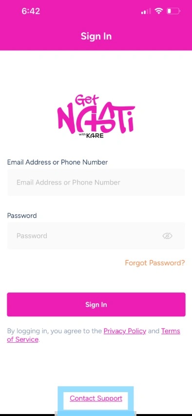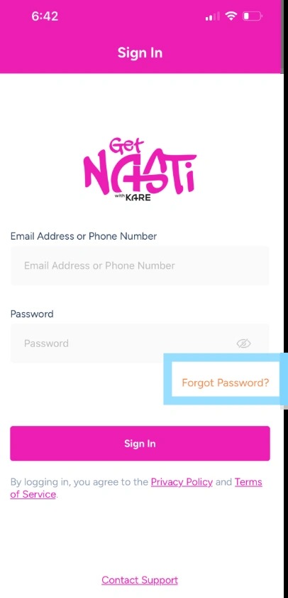 2. If employee needs their password reset, they may contact NASTi support by selecting Contact Support link within the app for a password reset.