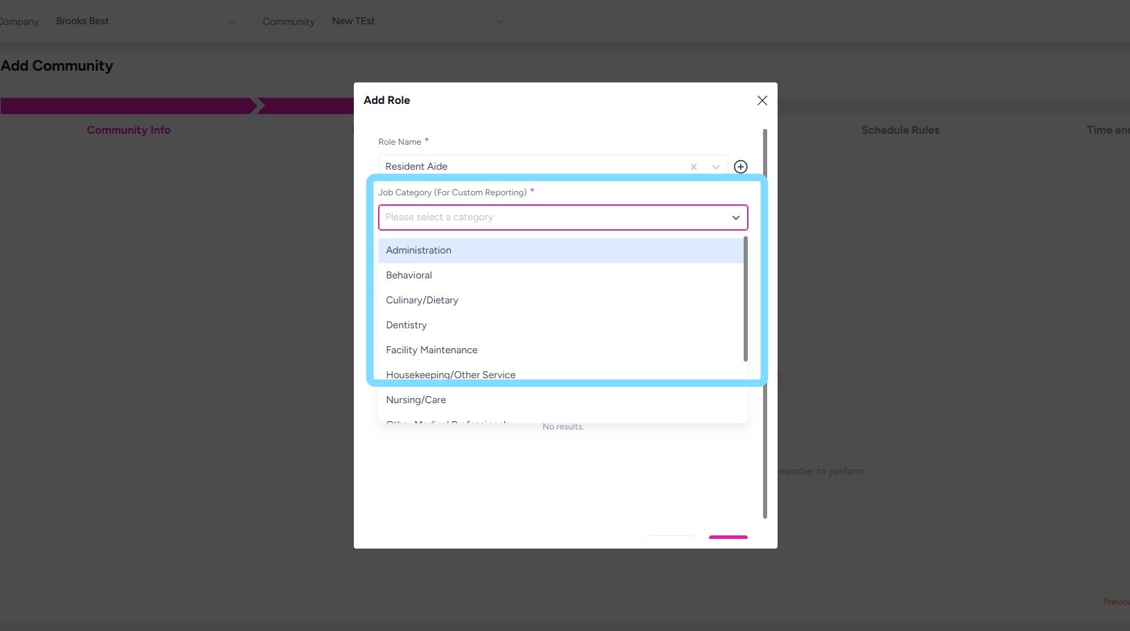 These fields allow the system to match roles to industry standard job titles and benchmark the data to eventually make available to senior living community users.