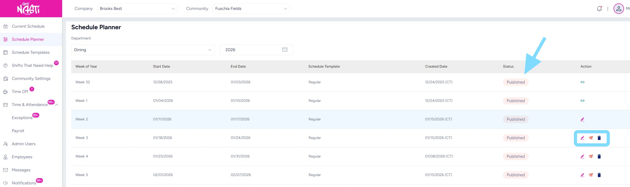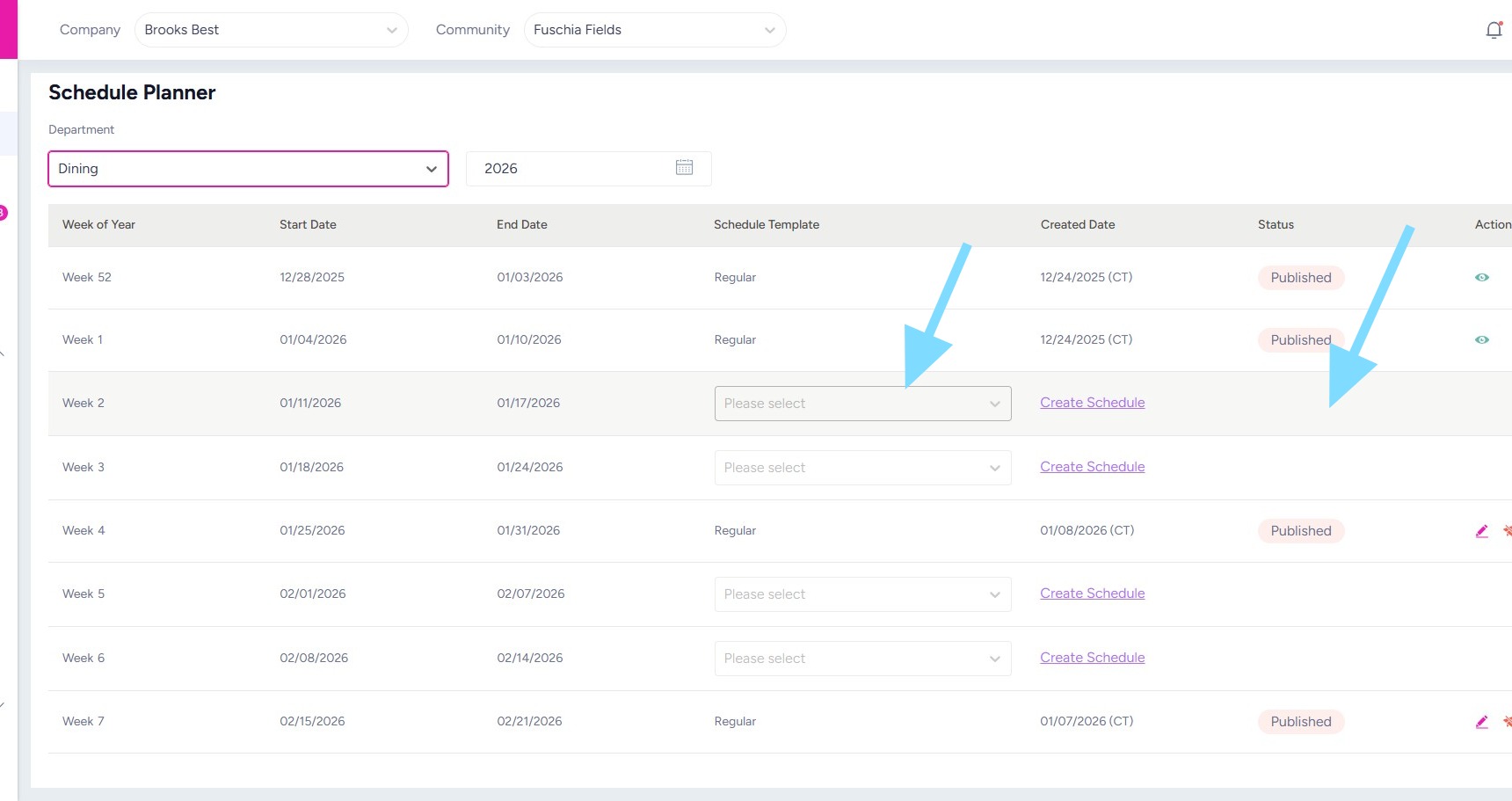 3. Note whether or not a Schedule Template was applied and published for each week of the year by looking at the Schedule Template and Status columns