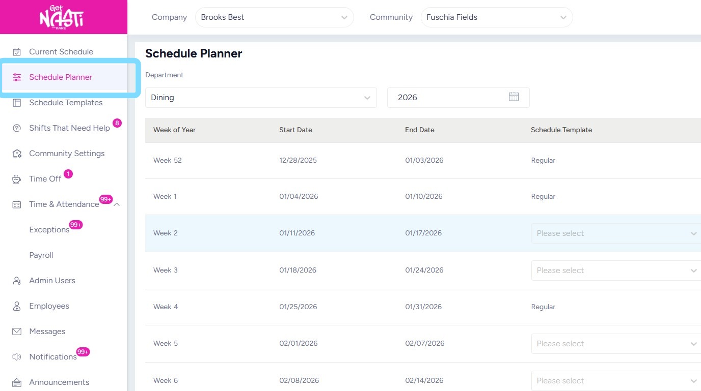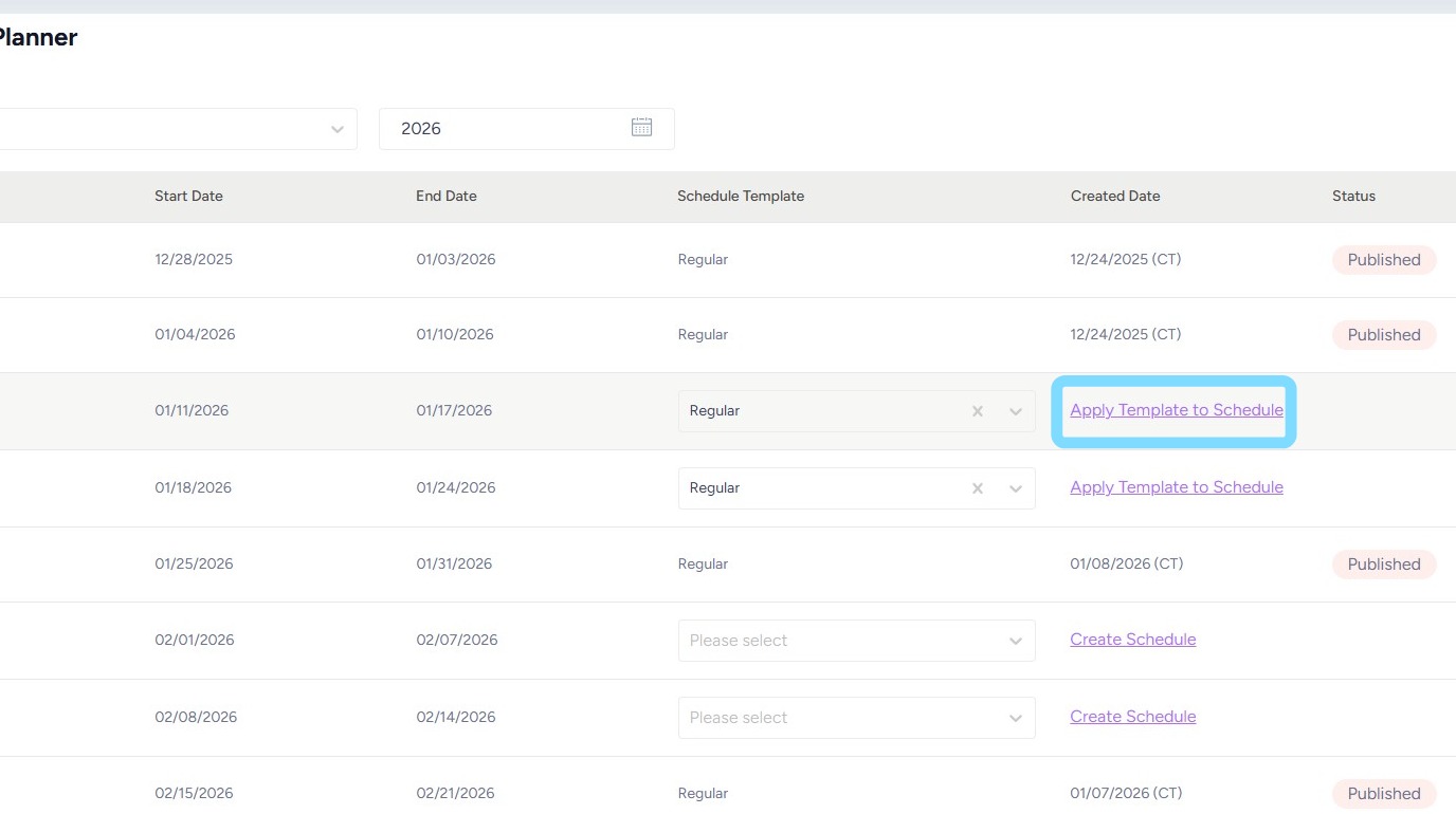 This Schedule Planner allows the Scheduler or Admin look through multiple weeks at a glance and ensure schedules are planned and published as far ahead as helpful. Use this guide to understand the process of applying schedule templates and publishing through use of the Schedule Planner.