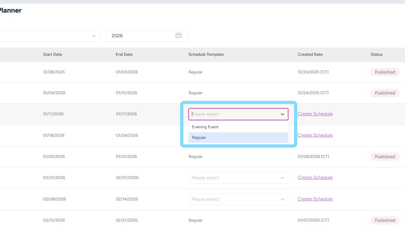 4. For weeks with missing schedules, apply a schedule by selecting from the Schedule Template dropdown box.
