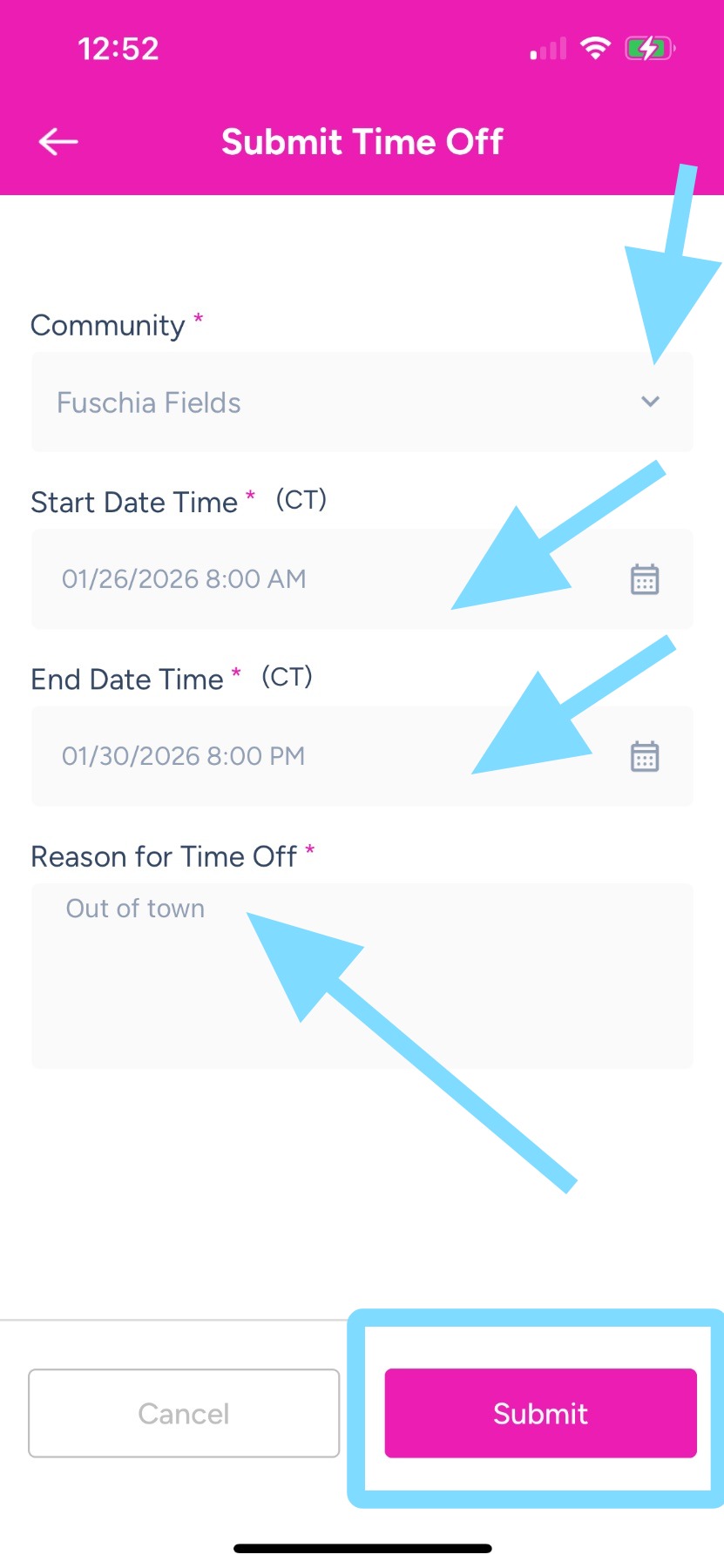 4. – Confirm the correct community is selected. If you need to request time off for a different community, tap the down arrow in the Community field.
