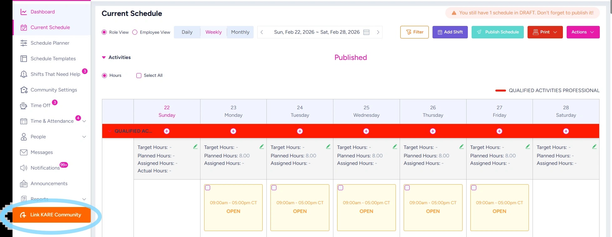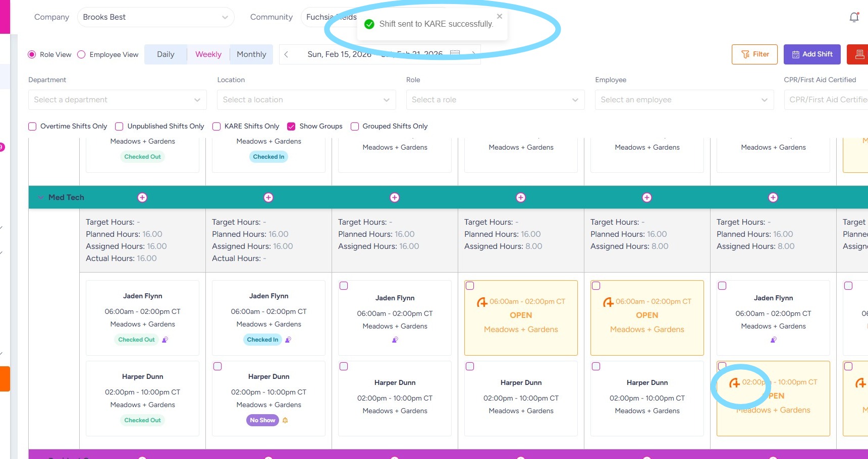 5. Now you’re ready to send open shifts to KARE. If Send to KARE Rules are set to send automatically, you’ll see OPEN shifts that were sent to KARE are marked with a KARE logo.