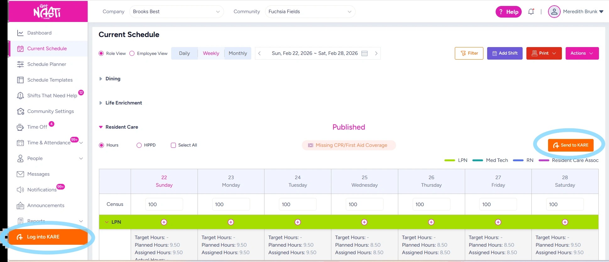 You’ll know the integration is active when you see the Log into KARE button in the sidebar and the Send to KARE button on the Current Schedule.