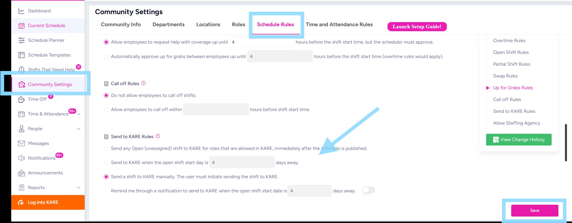 3. Once integrated, configure your Send to KARE Rules based on your community’s preference. You can choose to send open shifts to KARE automatically or send them manually as needed. To edit your Send to KARE Rules: