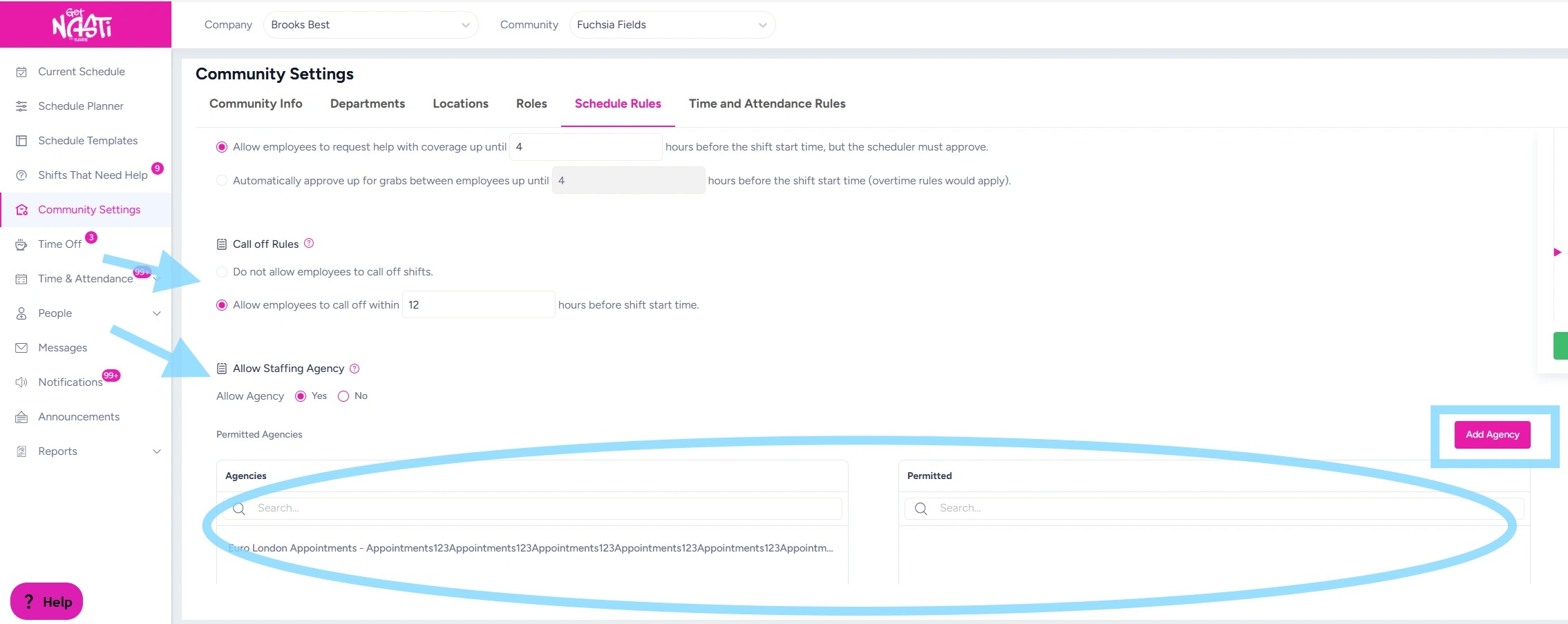5. For Allow Staffing Agency – this refers to whether you’ll want to add outside, agency staff into your schedule. If you select Yes, you’ll want to select Add Agency to add the agencies you plan to use.