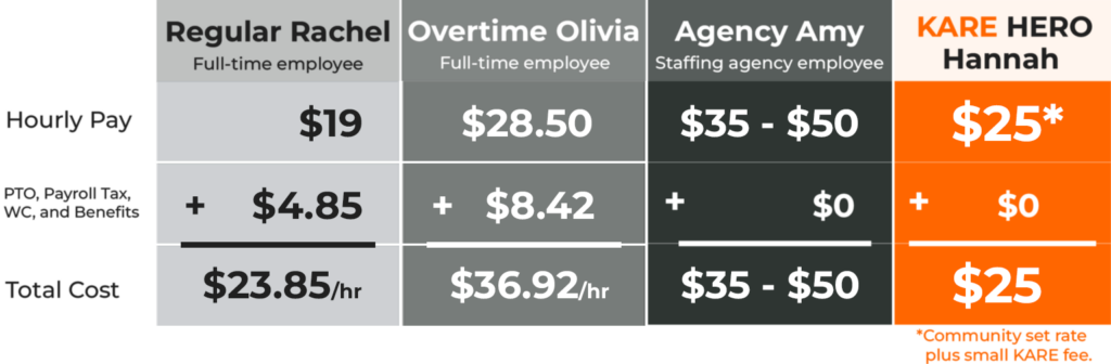 Still need help? With KARE, you decide how much you want to offer KARE Heroes to fill your shifts. Not what a staffing agency tells you to pay! KARE is always less than a staffing agency and almost always far less than expensive overtime.