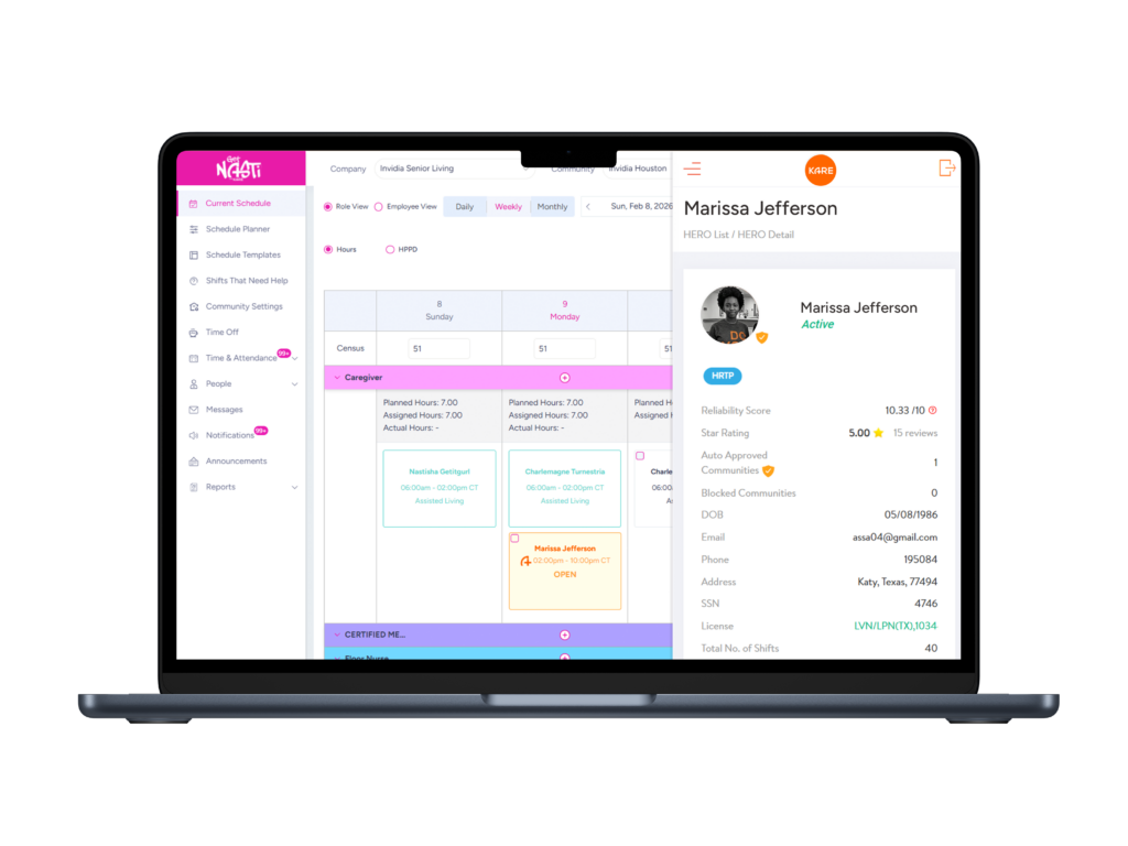 Whenever you need help, customers in qualifying states can help fill open gaps in their schedule by leveraging over 70,000 state compliant KARE Heroes who find extra work on the KARE marketplace. And if KARE is not something you need, that is ok too. Or you can automatically leverage the KARE Marketplace only if you can’t fill a shift internally. You can control all of this in your settings. NASTi will allow you to track your spending in KARE and how much you can save by using KARE instead of your staffing agencies or costly overtime, so you will always know you are making the best financial decision.